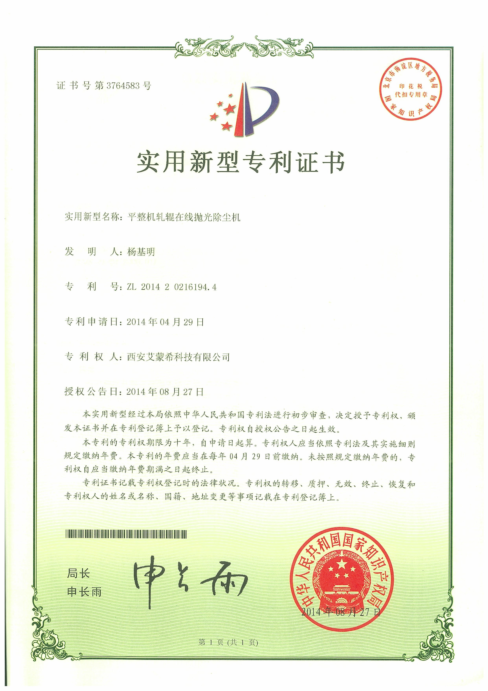 實用新型:平整機軋輥在線拋光除塵機